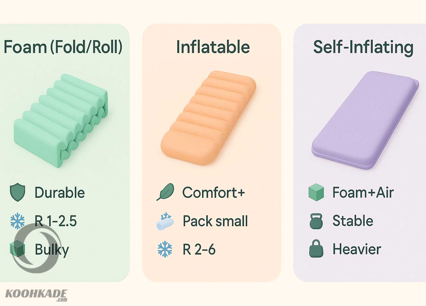 - نوع را انتخاب کنید: فومی (دوام/قیمت)، بادی (راحتی/فشرده)، خودبادشونده (میانه).