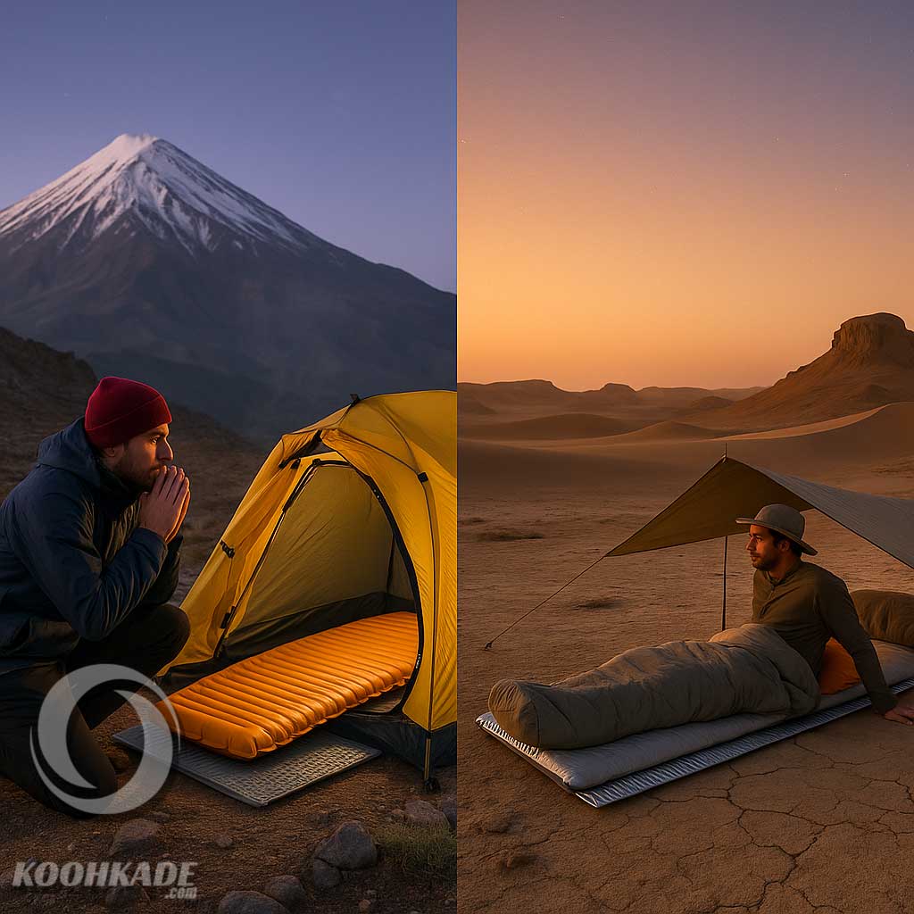 - دماوند/سبلان (تابستان): شبهای سرد و باد؛ R≈۳–۴ یا فومی+بادی. همیشه با کیسهخوابِ Comfort منفی ست کنید.