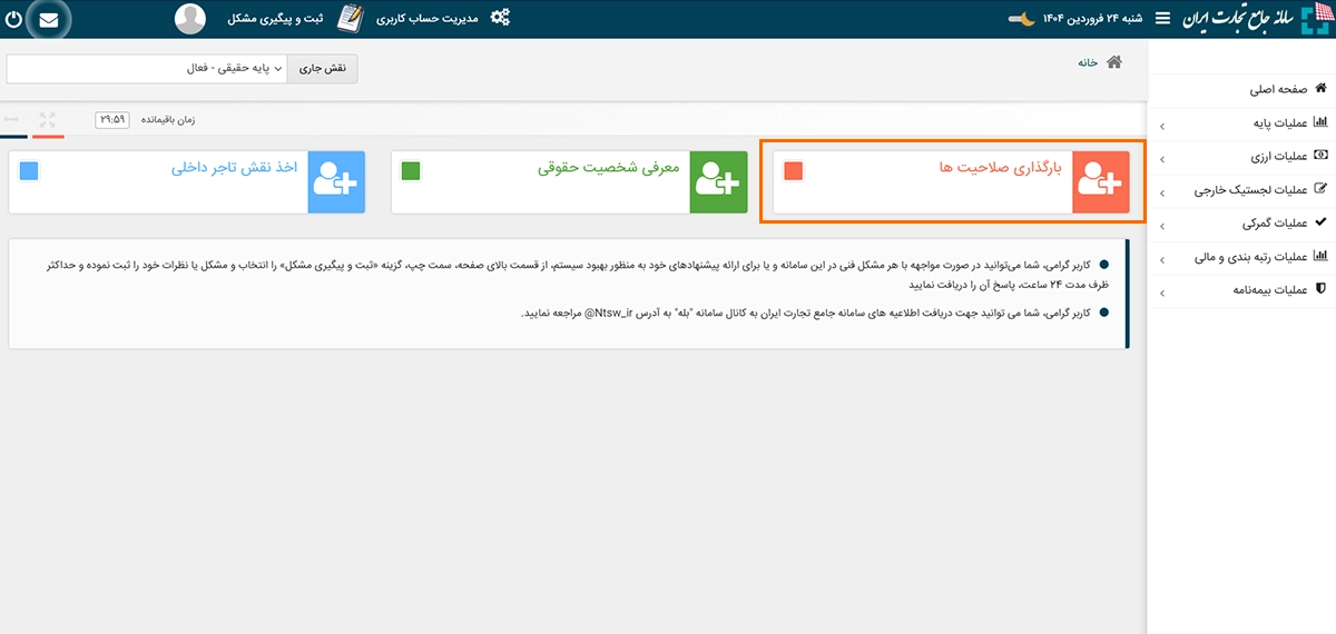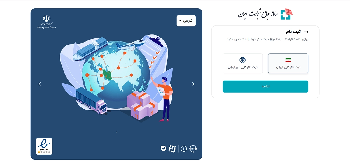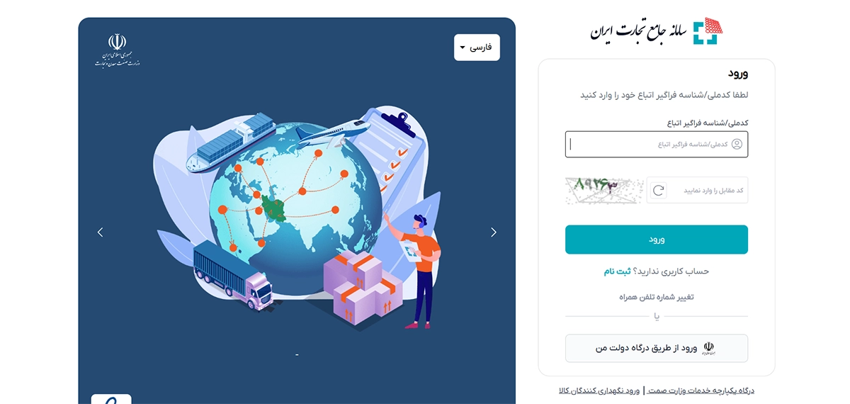 توجه: در صورتی که تا به حال در سامانه تجارت ثبت نام نکرده‌اید، گزینه ثبت نام را انتخاب کرده و اطلاعات مورد نیاز را برای ثبت نام در سامانه، وارد کنید.