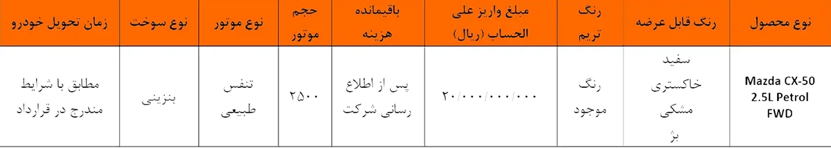 شرکت آفتاب خودرو از آغاز فرایند واریز وجه برای متقاضیان واردات خودروی Mazda CX-50 2.5L Petrol FWD ویژه جانبازان خبر داد. این مرحله مخصوص آن دسته از جانبازان معززی است که پیش‌تر با این شرکت قرارداد واردات خودرو منعقد کرده‌اند.