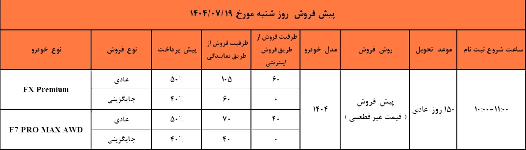 ظرفیت فروش اینترنتی طرح جایگزینی برای FX و تیگو ۷ پرو مکس ۶۰ دستگاه و برای آریزو ۶ جی تی ۴۰ دستگاه در نظر گرفته شده است.