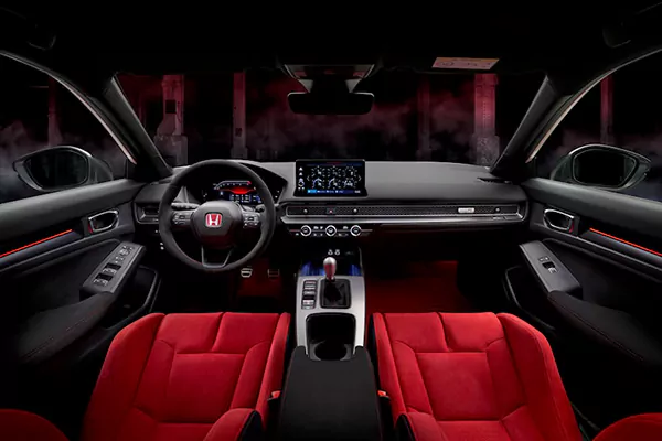 کابین تایپ R سراسر قرمز است. از کفپوش گرفته تا صندلیها و دوخت رودریها، همه چیز از رنگ قرمز بهره میبرد. صندلیهای هوندا سیویک تایپ R با روکش جیر مانندی پوشیده شدهاند که به گفته سازنده در پیچهای تند و رانندگی با G بالا، راننده و سرنشینان را سر جایشان ثابت نگه میدارد.