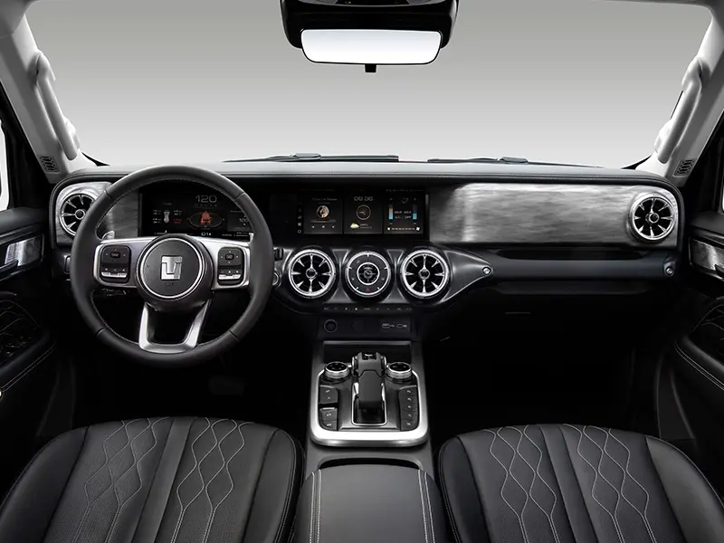 اما تانک ۳۰۰ با تعلق به خودروسازی از کشور چین، فضای داخلی بسیار مدرنی دارد که منطبق بر سالهای پس از ۲۰۲۰ است. داشبرد مینیمال اما ادغامشده با دو نمایشگر دیجیتال پیوسته کلاستر و مولتی مدیا، غربیلک سه شاخه اسپرت، استفاده از تریم تزئیناتی نقرهای با روکش رنگی صندلیها، مملو از کلیدهای کنترلی و البته دریچههای خروجی سیستم تهویه مطبوع که گویی مستقیما از محصولات مرسدس بنز قرض گرفته شدهاند، فضایی کاملا متفاوت با جیمنی را به سرنشینان هدیه میدهد.