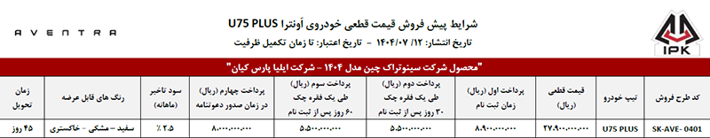 شرایط فروش نقدی و اعتباری اونترا U75 پلاس (۱۲ مهر ۱۴۰۴)