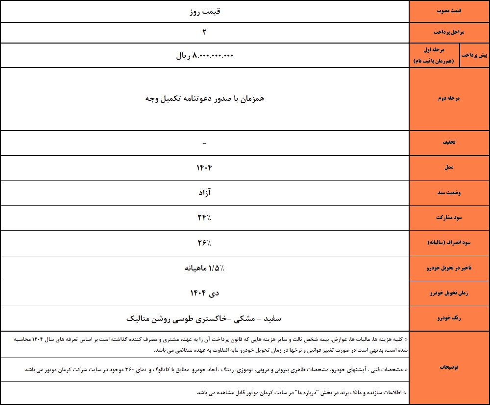 خودرو با سود مشارکت سالانه ۲۴ درصد، سود انصراف ۲۶ درصد و سود تأخیر در تحویل ۱.۵ درصد ماهیانه عرضه می‌شود. موعد تحویل خودرو دی‌ماه ۱۴۰۴ و بازه تحویل آن شش‌ماهه در نظر گرفته شده است. علاقه‌مندان می‌توانند جهت ثبت‌نام اینترنتی، به سایت رسمی کرمان موتور به نشانی customer.kermanmotor.ir مراجعه نمایند.