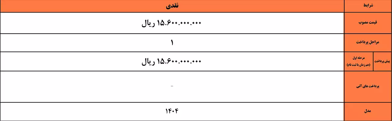 در این طرح، خریداران با پرداخت اولیه ۹۵۰ میلیون تومان می‌توانند ثبت‌نام خود را انجام دهند و تکمیل وجه در زمان صدور دعوت‌نامه صورت می‌گیرد.