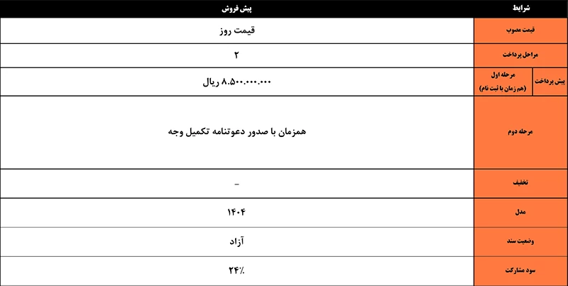 این پیش‌فروش با سود مشارکت ۲۲٪ و سود انصراف ۲۰٪ همراه است. همچنین، در صورت تاخیر در تحویل، سودی معادل ۱.۵٪ ماهیانه به مشتری تعلق می‌گیرد.