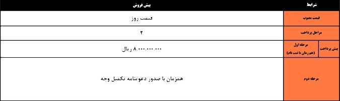 مبلغ پیشپرداخت مرحله اول ۸ میلیارد ریال است و مرحله دوم همزمان با صدور دعوتنامه تکمیل میشود.