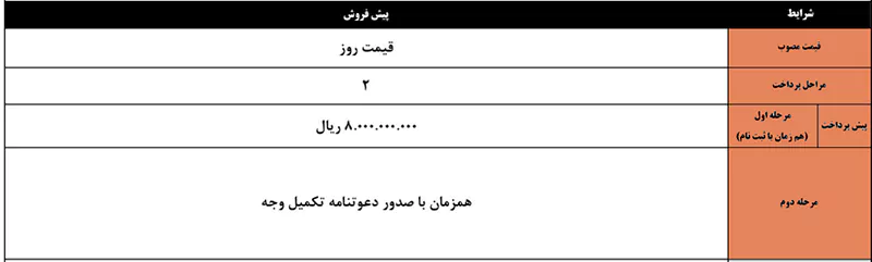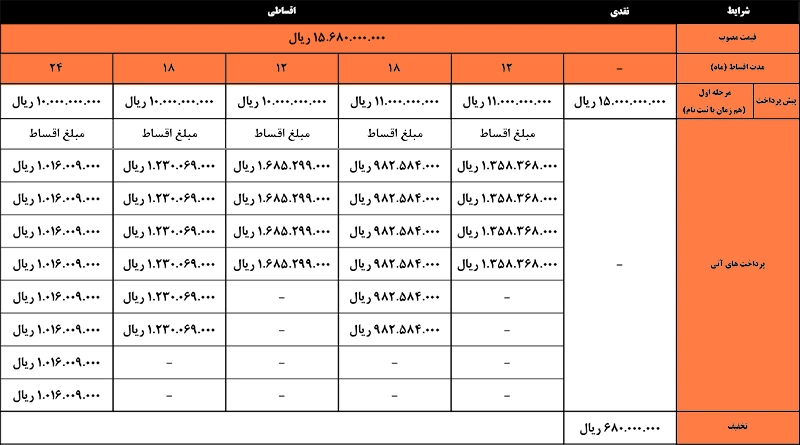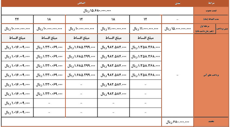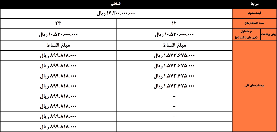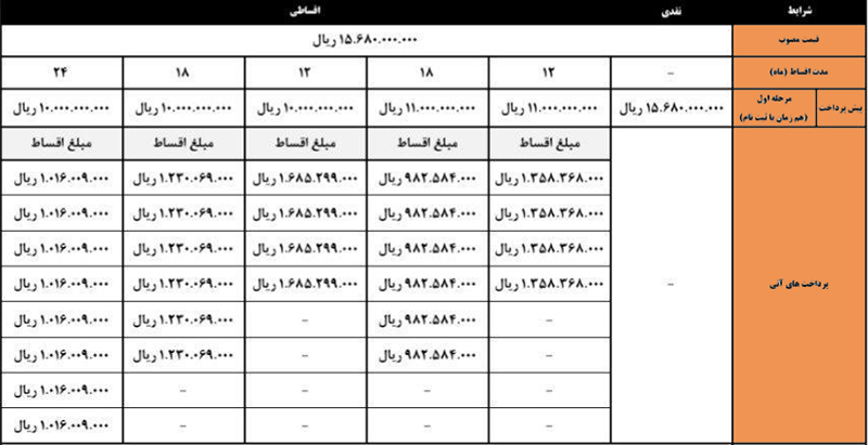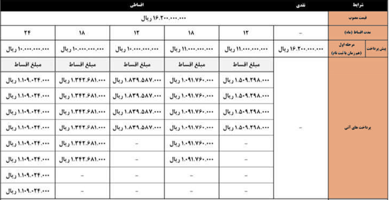 طرحهای اقساطی شامل شرایط ۱۲، ۱۸ و ۲۴ ماهه با پیشپرداخت ۱.۱ میلیارد تومان و یک میلیارد تومان است.