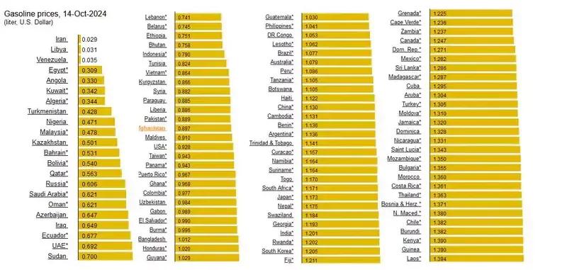 اگر نگاهی به قیمت بنزین برای هر لیتر در کشورهای اطراف داشته باشیم میبینیم که قیمت بنزین در کویت در حدود ۰.۳۴ دلار، ترکمنستان ۰.۴۳ دلار، قطر و عراق ۰.۵۷ دلار، افغانستان ۰.۹ دلار، ترکیه ۱.۳ دلار، روسیه ۰.۶ دلار، عمان ۰.۵۶ دلار، امارات ۰.۷۸ دلار و عربستان ۰.۶ دلار است.