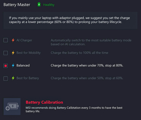 در سمت چپ این ماژو، ابزار Battery Master قرار دارد که امکان کنترل پیشرفته باتری را فراهم میسازد. کاربر میتواند بر اساس سناریوهای از پیش تعریف شده، نحوه شارژ شدن باتری را مدیریت کند؛ مثلاً تعیین کند در زمانی که آداپتور به سیستم متصل است، شارژ باتری فقط تا 80 درصد انجام شود تا فشار مداوم روی سلولها کاهش یابد. همچنین قابلیت اجرای کالیبراسیون دورهای باتری (معمولاً هر سه ماه یک بار) نیز در همین بخش در دسترس است که با همتراز کردن ظرفیت واقعی و ظرفیت گزارششده، دقت سنجش سطح شارژ و عمر مفید باتری را حفظ میکند.
