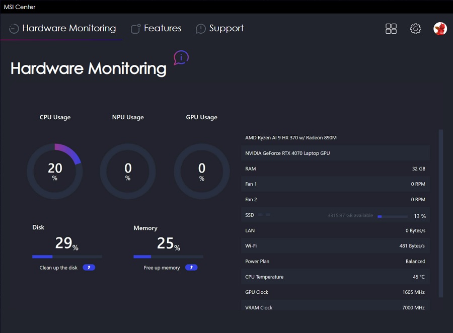نکته کلیدی در رابطه با بخش Hardware Monitoring این است که ماژول مذکور در دستگاههای مجهز به NPU کاملاً با موتور هوش مصنوعی در ارتباط است. اطلاعات دما، توان و بار کاری بهطور همزمان به موتور هوش مصنوعی نرمافزار منتقل میشوند تا سیستم بتواند الگوی مصرف را تحلیل و در زمان واقعی تنظیمات مناسب را اعمال کند.
