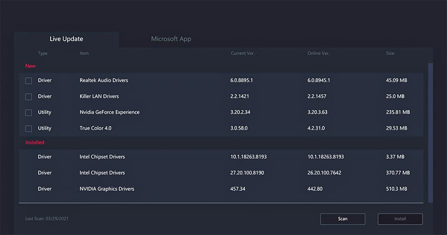 در صورتی که هیچ درایوری در لیست مشاهده نشد، کافی است گزینه Scan را انتخاب کنید تا MSI Center سیستم شما را بهصورت کامل بررسی کرده و فهرست آخرین درایورها و ابزارهای پیشنهادی برای مدل خاص دستگاه را ارائه دهد. این ماژول عملاً فرآیند نگهداری و بهروزرسانی سیستم را به سادهترین و مطمئنترین شکل یکپارچه میکند.