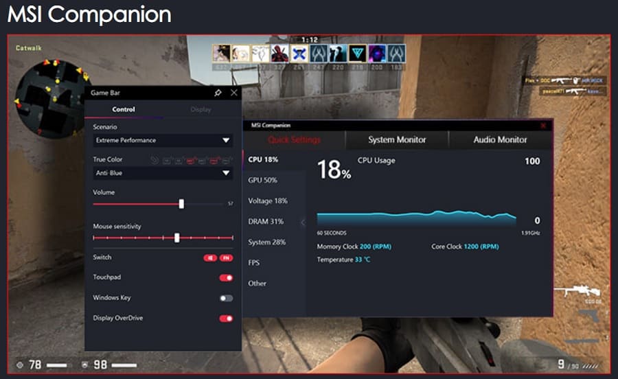 یکی دیگر از ویژگی های برنامه MSI Center که برای گیمرها بسیار کاربردی محسوب میشود، MSI Companion نام دارد. ماژول MSI Companion به عنوان یک رابط کاربری شناور عمل میکند که میتوان آن را در هر لحظه روی صفحه فعال نمود. این ابزار اطلاعات لحظهای مربوط به عملکرد سیستم شامل فریمریت، مصرف منابع، دمای قطعات و وضعیت شبکه را نمایش میدهد و در کنار آن امکان اعمال تغییرات فوری در تنظیمات نرمافزاری، بدون نیاز به خروج از بازی را فراهم میسازد.
