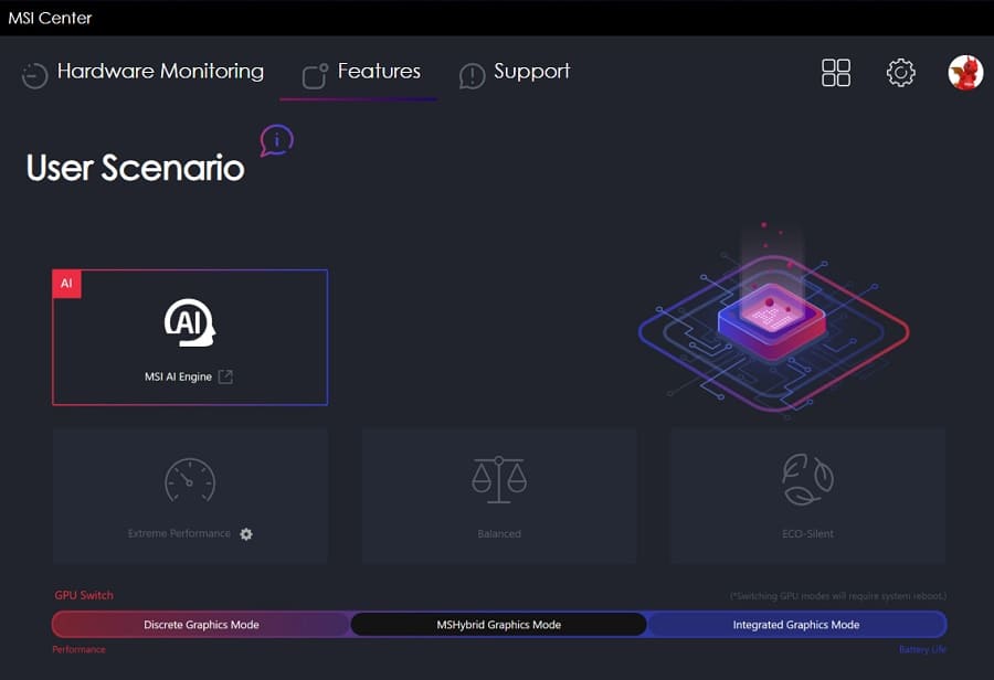 بخش پایینی از User Scenario یکی از ویژگی های برنامه MSI Center برای سیستمهای مجهز به دو پردازنده گرافیکی است؛ یعنی دستگاههایی که یک GPU مجتمع (Integrated) در کنار یک GPU مجزا (Discrete) دارند. در این حالت، برنامه گزینه GPU Switch را ارائه میدهد تا کاربر بتواند انجام پردازشهای گرافیک را به یکی از آنها بسپارد.