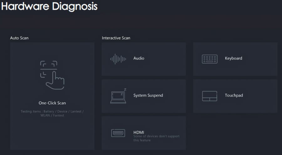 در این پنل، کاربر میتواند با اجرای تستهای مرحلهای، از عملکرد صحیح هر مؤلفه اطمینان پیدا کند. برای مثال، تست کیبورد کلیه کلیدها را بررسی کرده و در صورت وجود کلیدهای از کار افتاده آنها را مشخص میسازد؛ تست Audio کیفیت صدا و عملکرد ورودی و خروجیهای صوتی را پایش میکند؛ آزمایش تاچپد به تشخیص دقت لمس و پاسخدهی میپردازد و بخش شبکه یا Network نیز اتصالات بیسیم و باسیم را از نظر ثبات و سرعت بررسی میکند.
