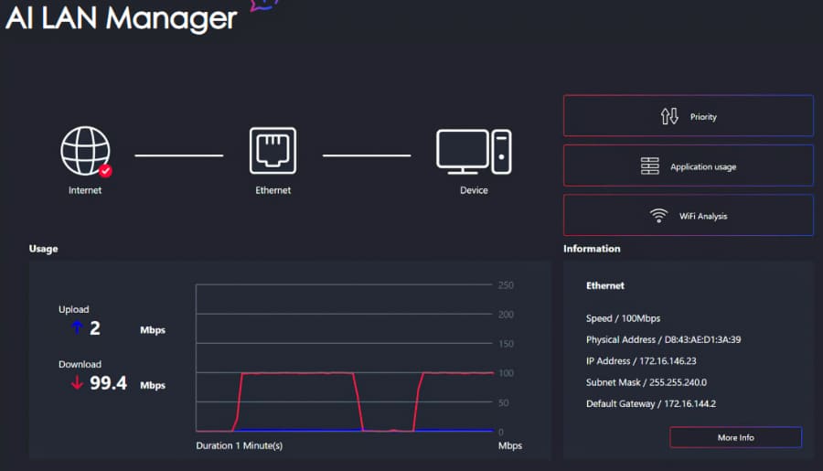 در نهایت به ماژول AI Lan Manager میرسید که برای کنترل و بهینهسازی ترافیک شبکه توسط هوش مصنوعی طراحی شده است. این ابزار با تحلیل نوع فعالیت کاربر، پهنای باند ارتباطات را بهصورت هوشمند تقسیم میکند تا اولویت با نرمافزارهای حیاتی باشد.