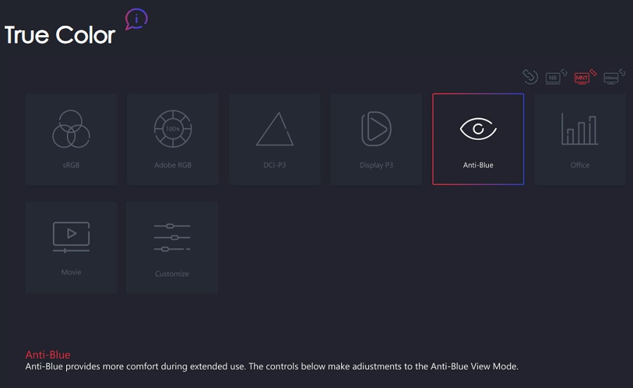 - Anti‑Blue Light Mode: حذف هدفمند طیف مضر نور آبی بدون تغییر محسوس در رنگ طبیعی تصویر؛ در برخی نمایشگرها، این عملکرد بهصورت سختافزاری با فناوری اختصاصی شرکت ام اس آی یعنی Less Blue Light Pro پیادهسازی شده است.
