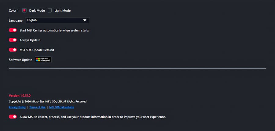 در پایین صفحه، تنظیمی برای ارسال و تحلیل دادههای کاربری به MSI نیز دیده میشود که صرفاً با هدف بهبود تجربه کاربری (User Experience) مورد استفاده قرار میگیرد. نسخه نرمافزار و لینکهای دسترسی سریع به Privacy Policy، Terms of Use و وبسایت رسمی MSI نیز در همین بخش درج شدهاند.