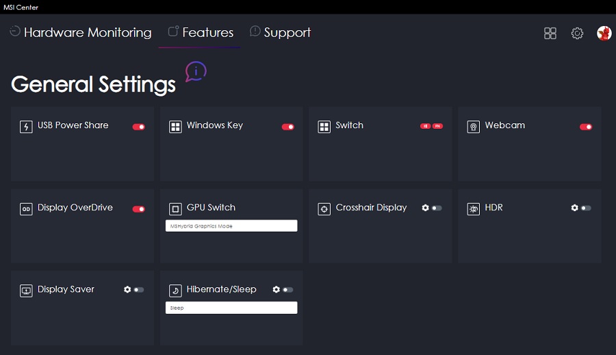 در بخش بعدی به تنظیمات MSI Center یا بخش General Settings میرسیم که در آن کاربر قادر است رفتار کلی سیستم را مطابق نیاز خود تنظیم کند.