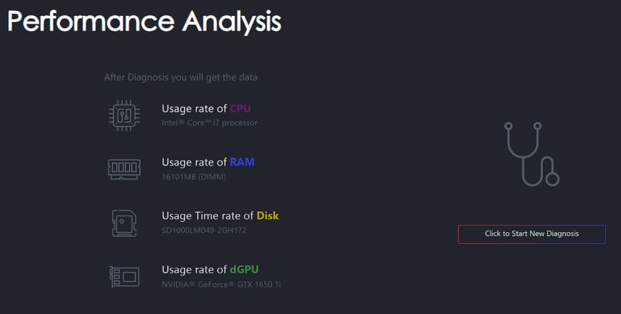 ماژول Performance Analysis در MSI Center بهعنوان بخش تکمیلی دو ماژول System Diagnosis و Hardware Diagnosis طراحی شده است. این ماژول امکان تحلیل سریع و جامع عملکرد سختافزارهای اصلی سیستم را فراهم میکند و با اجرای یک فرآیند هوشمند، شاخصهای کلیدی مربوط به پردازنده (CPU)، حافظه رم (Memory)، درایوهای ذخیرهسازی (Storage) و پردازنده گرافیکی (GPU) را مورد سنجش قرار میدهد.
