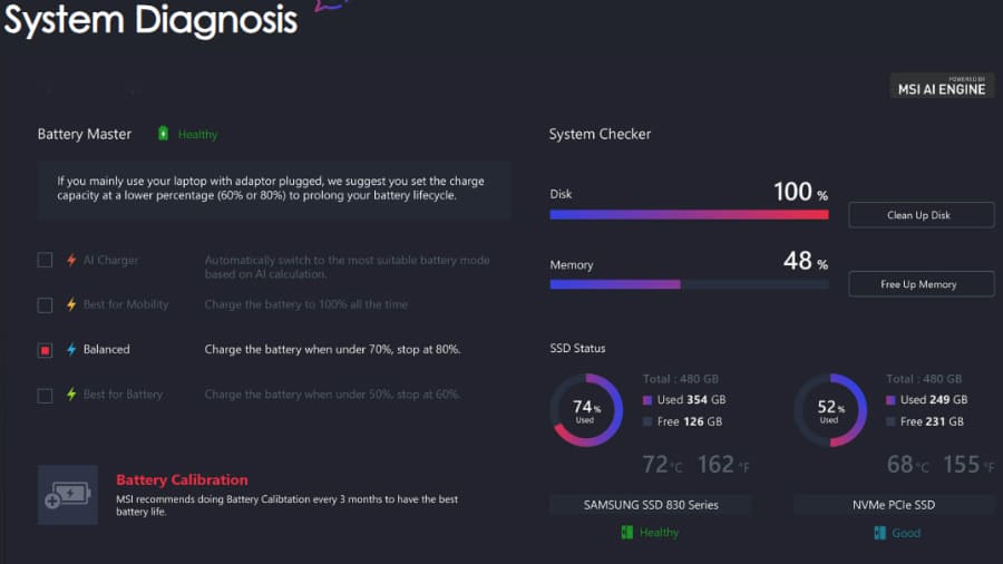 ماژول System Diagnosis در MSI Center بهعنوان مرکز نظارت بر سلامت عمل کرده و اطلاعات جامعی از وضعیت لحظهای قطعات، بهویژه درایوهای ذخیرهسازی و حافظه رم را در اختیار کاربر قرار میدهد.