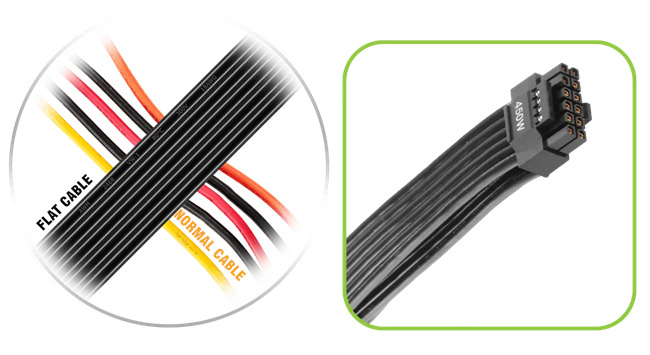 تمام کابلها فلت و مشکی رنگ هستند و با شاخههای 16AWG امکان عبور جریان بیشتر و کاهش افت ولتاژ را فراهم میکنند. این طراحی علاوه بر زیبایی، جریان هوای داخلی کیس را بهینه کرده و کابلکشی مرتب و حرفهای را ممکن میسازد.
