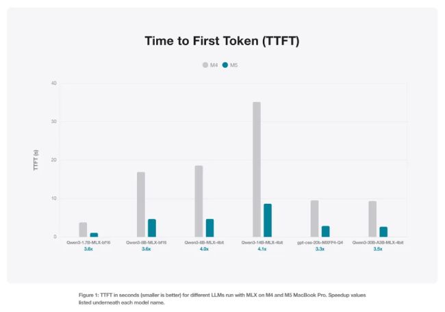 برای بهبود این کار، اپل شتابدهندههای عصبی جدیدی را در GPU تراشه M5 قرار داده که وظیفه پردازش اختصاصی ضرب ماتریسها را برعهده دارند. دادههای منتشر شده توسط اپل نشان میدهد مدل Qwen 14B زمان پردازش را از 35.15 ثانیه در تراشه M4 به 8.66 ثانیه در M5 رسانده که حدود 4.1 برابر کاهش را نشان میدهد.