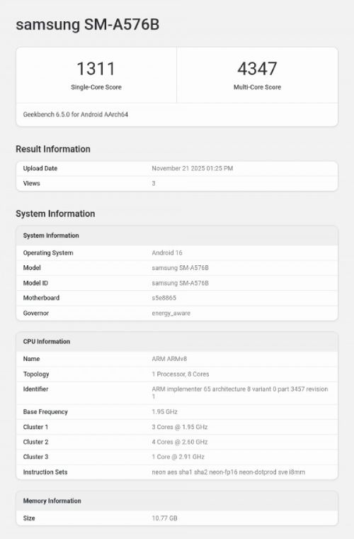 طبق دادههای گیکبنچ، گلکسی A57 از تراشه اگزینوس 1680 بهره میبرد. این تراشه جانشین مستقیم اگزینوس 1580 در مدل A56 خواهد بود. ظاهراً با نمونه اولیه این گوشی طرف هستیم و نتایج فعلی نباید معیار قطعی عملکرد آن به حساب بیاید، اما امتیازات اولیه تصویری کلی از سطح توان پردازشی دستگاه را به نمایش گذاشته است.