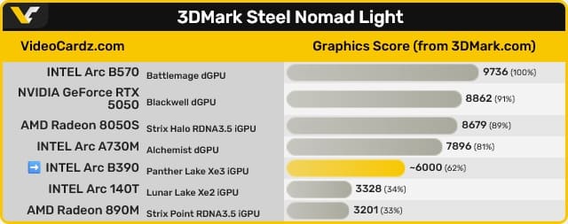 اطلاعات جدید از گرافیک مجتمع Intel Arc B390 در پردازندههای Panther Lake نشان میدهد که این تراشه در بنچمارک Time Spy موفق به شکست RTX 3050 و ثبت عملکردی دو برابر بهتر از Radeon 890M در پردازندههای Strix Point شده است.