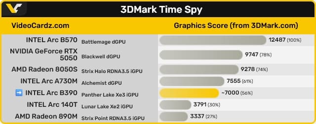 امتیاز ۷۰۰۰ در Time Spy نشان میدهد که Arc B390حدود ۱۲ درصد سریعتر از نسخه دسکتاپ کارت گرافیک NVIDIA GeForce RTX 3050 عمل کرده است. همچنین، در مقایسه با گرافیک مجتمع Radeon 890M در پردازندههای Ryzen AI 300 شرکت AMD، نماینده اینتل عملکردی تقریباً دو برابر سریعتر از خود نشان داده است.