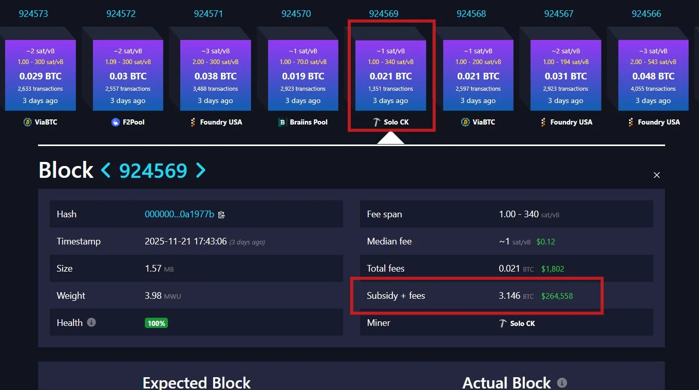 در اتفاقی که بیشتر به معجزه شبیه است تا واقعیت روزمره ماینینگ، یک ماینر هابیست (ماینر فردی و کوچکمقیاس) موفق شد با قدرت ناچیزی معادل ۰.۰۰۰۰۰۰۷ درصد از کل هشریت شبکه بیتکوین، یک بلاک کامل را به تنهایی استخراج کند و جایزهای حدود ۳.۱۴۶ بیتکوین به همراه کارمزد تراکنشها (در مجموع نزدیک به ۲۷۰ هزار دلار با قیمت فعلی) نصیب خود کند.